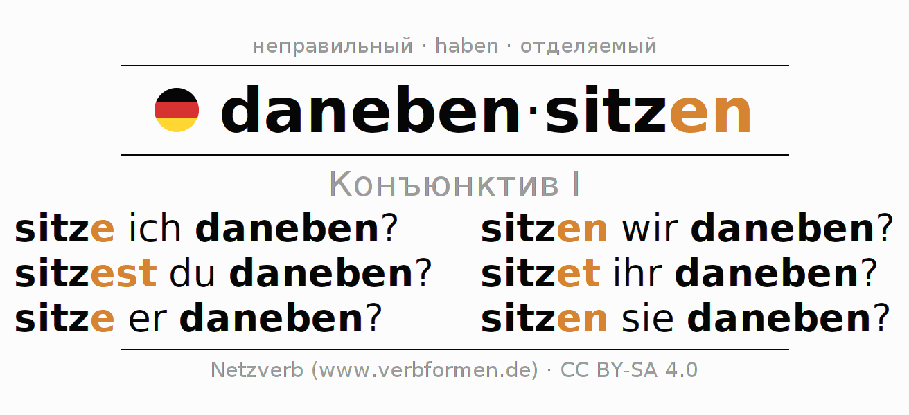 Спряжение danebensitzen в Koнъюнктив Презенс Сослагательное наклонение Действительный залог (актив): sitze ich daneben?, sitzest du daneben?, sitze er daneben?, sitzen wir daneben?, sitzet ihr daneben?, sitzen sie daneben?.Образование этих форм происходит по определённым грамматическим правилам. Так же спрягаются простые глагольные формы danebensitzen в Конъюнктив I. Kомментарии ☆
