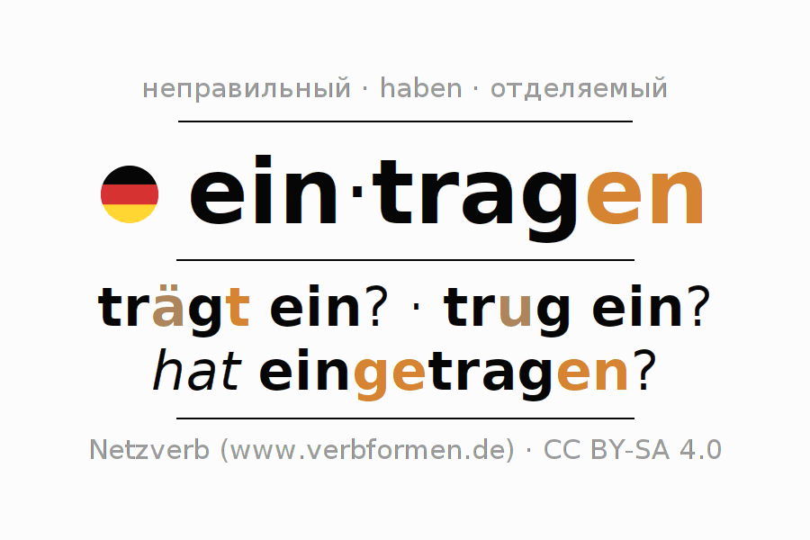 Спряжение eintragen в Koнъюнктив Презенс Сослагательное наклонение Действительный залог (актив): trage ich ein?, tragest du ein?, trage er ein?, tragen wir ein?, traget ihr ein?, tragen sie ein?.Образование этих форм происходит по определённым грамматическим правилам. Так же спрягаются простые глагольные формы eintragen в Конъюнктив I. Kомментарии ☆