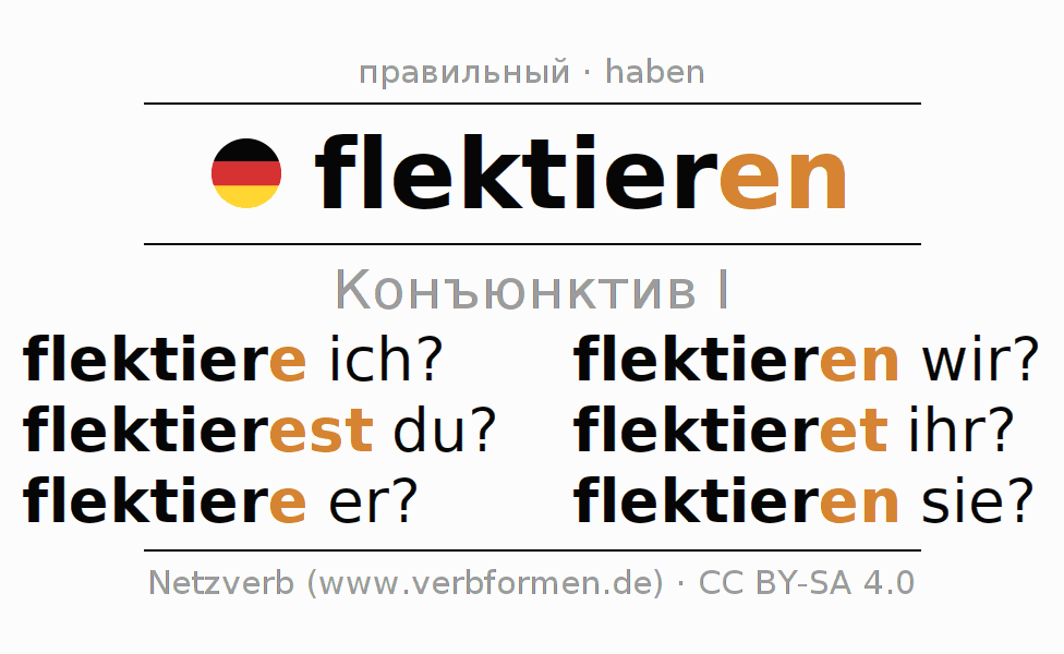 Спряжение flektieren в Koнъюнктив Презенс Сослагательное наклонение Действительный залог (актив): flektiere ich?, flektierest du?, flektiere er?, flektieren wir?, flektieret ihr?, flektieren sie?.Образование этих форм происходит по определённым грамматическим правилам. Так же спрягаются простые глагольные формы flektieren в Конъюнктив I. Kомментарии ☆