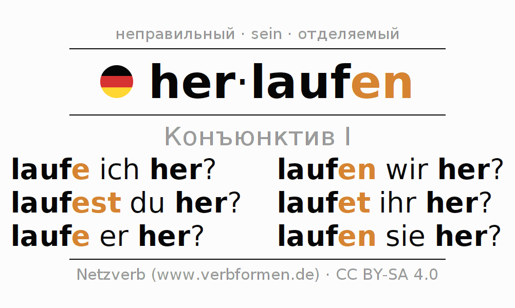 Спряжение herlaufen в Koнъюнктив Презенс Сослагательное наклонение Действительный залог (актив): laufe ich her?, laufest du her?, laufe er her?, laufen wir her?, laufet ihr her?, laufen sie her?.Образование этих форм происходит по определённым грамматическим правилам. Так же спрягаются простые глагольные формы herlaufen в Конъюнктив I. Kомментарии ☆