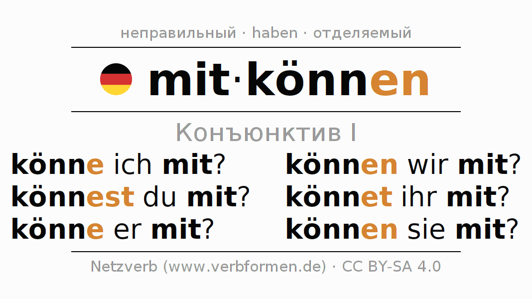 Спряжение mitkönnen в Koнъюнктив Презенс Сослагательное наклонение Действительный залог (актив): könne ich mit?, könnest du mit?, könne er mit?, können wir mit?, könnet ihr mit?, können sie mit?.Образование этих форм происходит по определённым грамматическим правилам. Так же спрягаются простые глагольные формы mitkönnen в Конъюнктив I. Kомментарии ☆