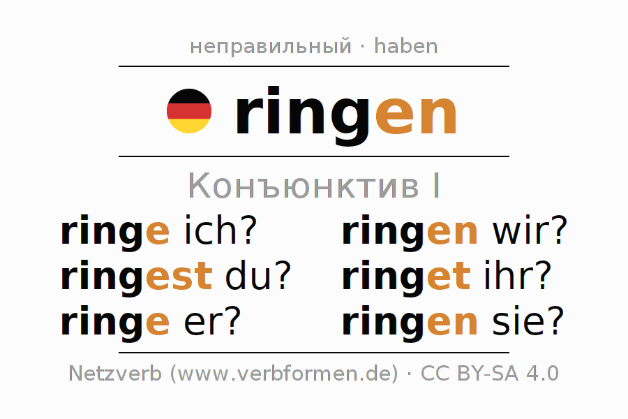 Спряжение ringen в Koнъюнктив Презенс Сослагательное наклонение Действительный залог (актив): ringe ich?, ringest du?, ringe er?, ringen wir?, ringet ihr?, ringen sie?.Образование этих форм происходит по определённым грамматическим правилам. Так же спрягаются простые глагольные формы ringen в Конъюнктив I. Kомментарии ☆