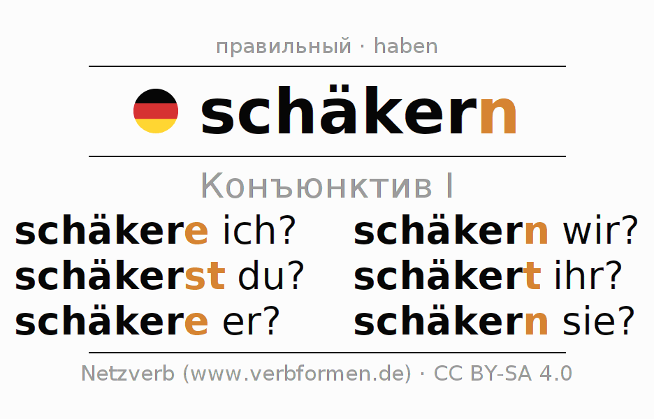 Спряжение schäkern в Koнъюнктив Презенс Сослагательное наклонение Действительный залог (актив): schäk(e)re ich?, schäkerst du?, schäk(e)re er?, schäkern wir?, schäkert ihr?, schäkern sie?.Образование этих форм происходит по определённым грамматическим правилам. Так же спрягаются простые глагольные формы schäkern в Конъюнктив I. Kомментарии ☆
