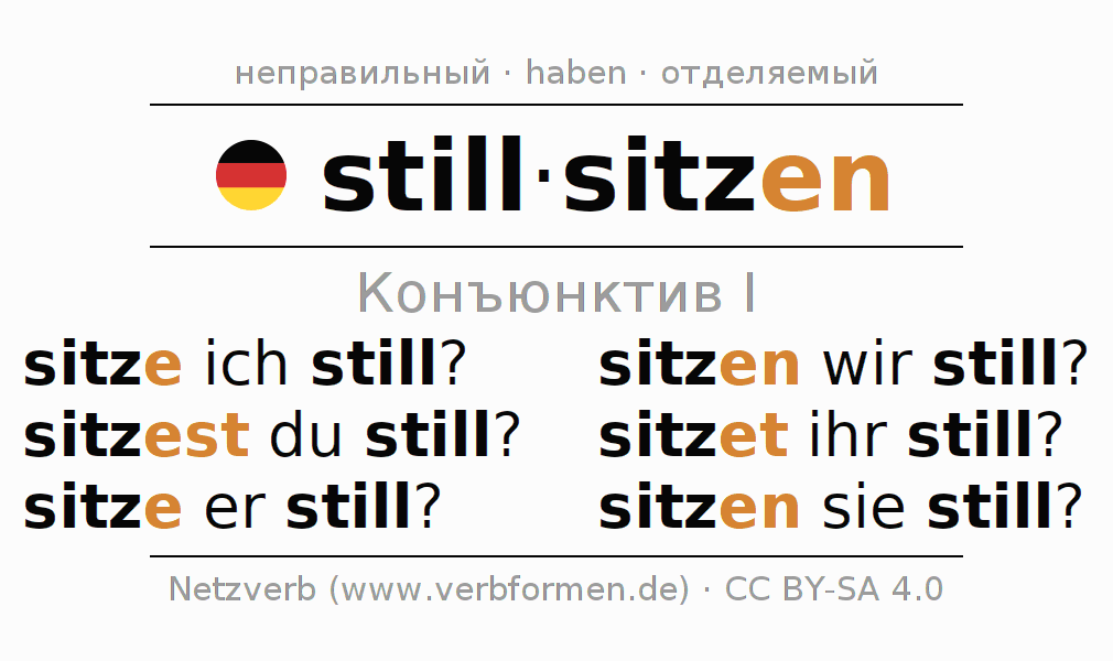 Спряжение stillsitzen в Koнъюнктив Презенс Сослагательное наклонение Действительный залог (актив): sitze ich still?, sitzest du still?, sitze er still?, sitzen wir still?, sitzet ihr still?, sitzen sie still?.Образование этих форм происходит по определённым грамматическим правилам. Так же спрягаются простые глагольные формы stillsitzen в Конъюнктив I. Kомментарии ☆