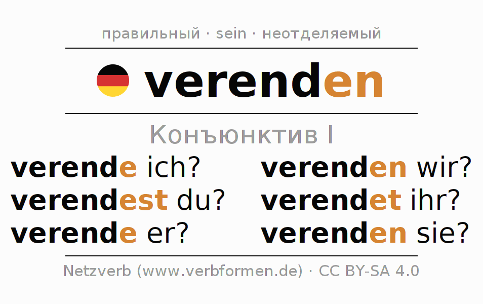 Спряжение verenden в Koнъюнктив Презенс Сослагательное наклонение Действительный залог (актив): verende ich?, verendest du?, verende er?, verenden wir?, verendet ihr?, verenden sie?.Образование этих форм происходит по определённым грамматическим правилам. Так же спрягаются простые глагольные формы verenden в Конъюнктив I. Kомментарии ☆