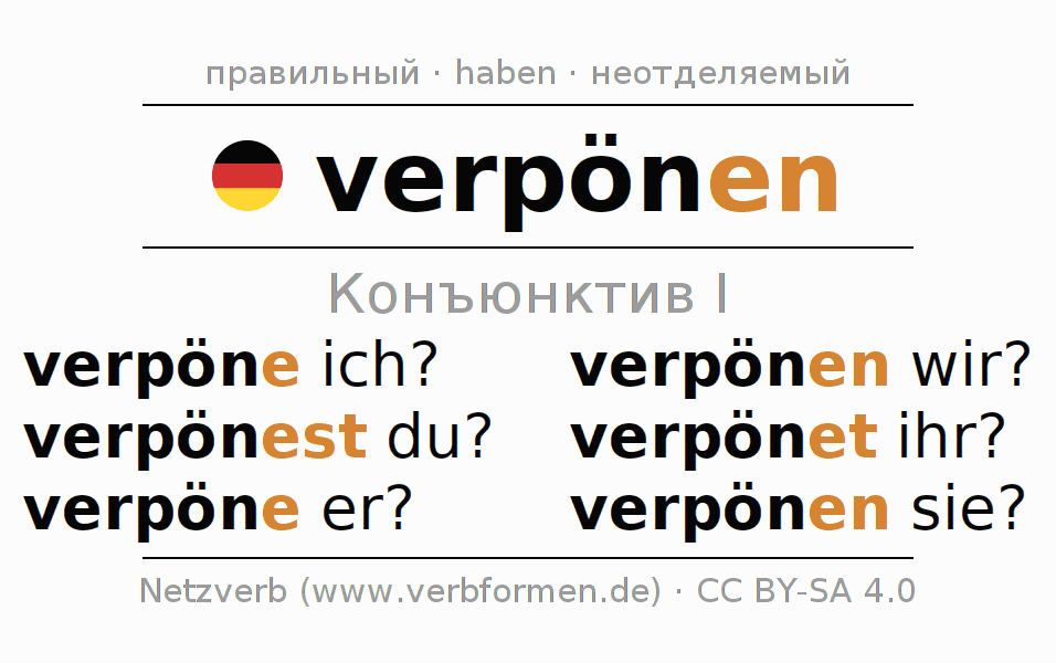 Спряжение verpönen в Koнъюнктив Презенс Сослагательное наклонение Действительный залог (актив): verpöne ich?, verpönest du?, verpöne er?, verpönen wir?, verpönet ihr?, verpönen sie?.Образование этих форм происходит по определённым грамматическим правилам. Так же спрягаются простые глагольные формы verpönen в Конъюнктив I. Kомментарии ☆