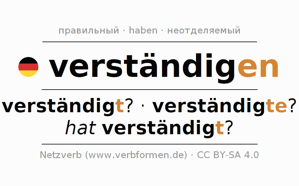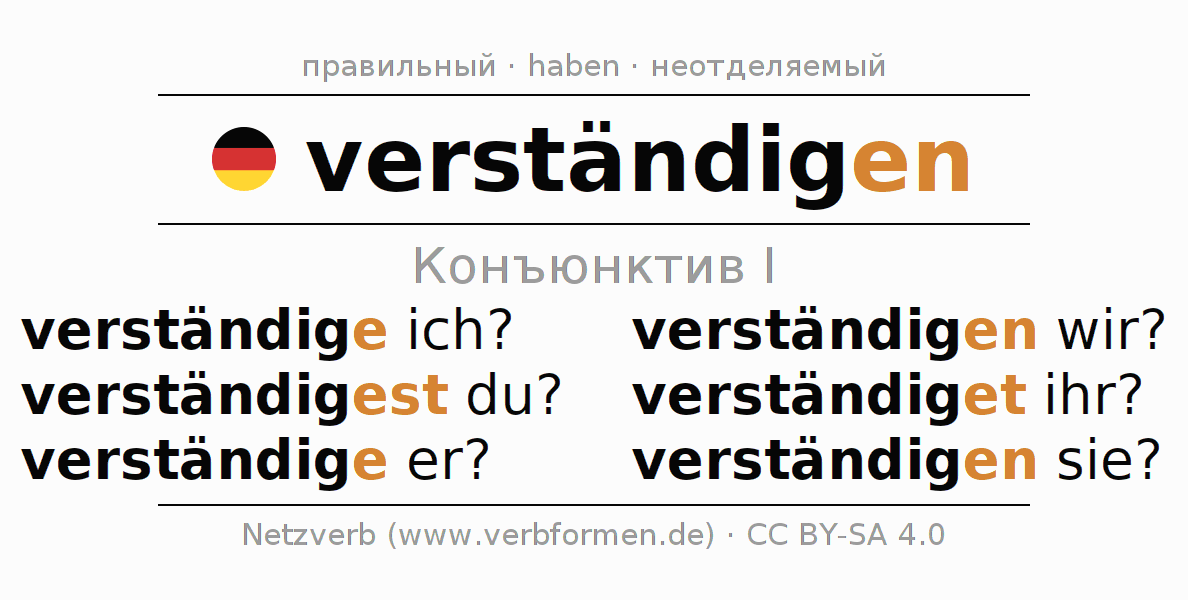 Спряжение verständigen в Koнъюнктив Презенс Сослагательное наклонение Действительный залог (актив): verständige ich?, verständigest du?, verständige er?, verständigen wir?, verständiget ihr?, verständigen sie?.Образование этих форм происходит по определённым грамматическим правилам. Так же спрягаются простые глагольные формы verständigen в Конъюнктив I. Kомментарии ☆