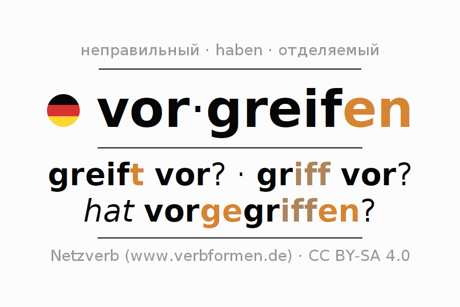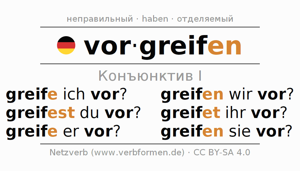 Спряжение vorgreifen в Koнъюнктив Презенс Сослагательное наклонение Действительный залог (актив): greife ich vor?, greifest du vor?, greife er vor?, greifen wir vor?, greifet ihr vor?, greifen sie vor?.Образование этих форм происходит по определённым грамматическим правилам. Так же спрягаются простые глагольные формы vorgreifen в Конъюнктив I. Kомментарии ☆