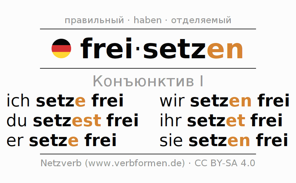 Спряжение freisetzen (освобождать, освободить) в сослагательном наклонении I: ich setze frei, du setzest frei, er setze frei, wir setzen frei, ihr setzet frei, sie setzen frei.