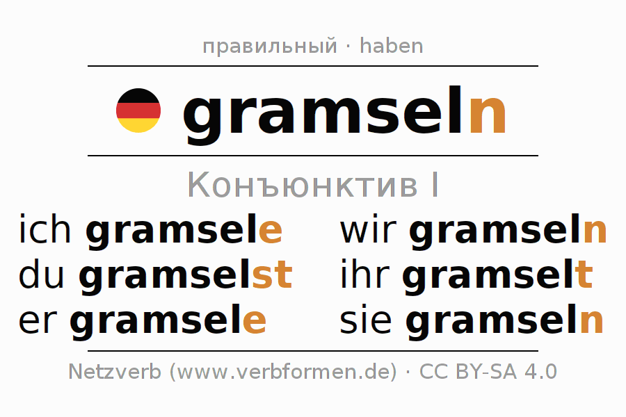 Спряжение gramseln (извиваться, крутиться) в сослагательном наклонении I: ich grams(e)le, du gramselst, er grams(e)le, wir gramseln, ihr gramselt, sie gramseln.