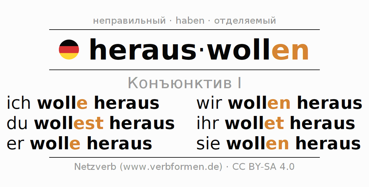 Спряжение herauswollen (выйти, выходить) в сослагательном наклонении I: ich wolle heraus, du wollest heraus, er wolle heraus, wir wollen heraus, ihr wollet heraus, sie wollen heraus.