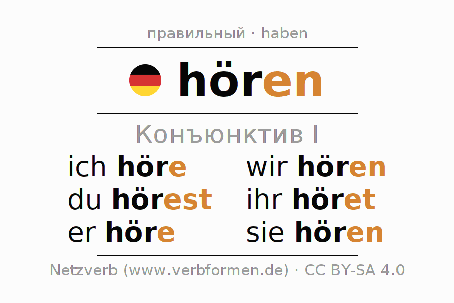 Спряжение hören (слушать, слышать) в сослагательном наклонении I: ich höre, du hörest, er höre, wir hören, ihr höret, sie hören.