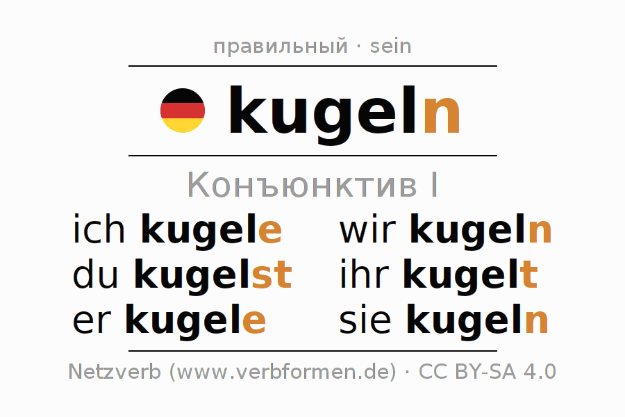 Спряжение kugeln (катиться, катать) в сослагательном наклонении I: ich kug(e)le, du kugelst, er kug(e)le, wir kugeln, ihr kugelt, sie kugeln.