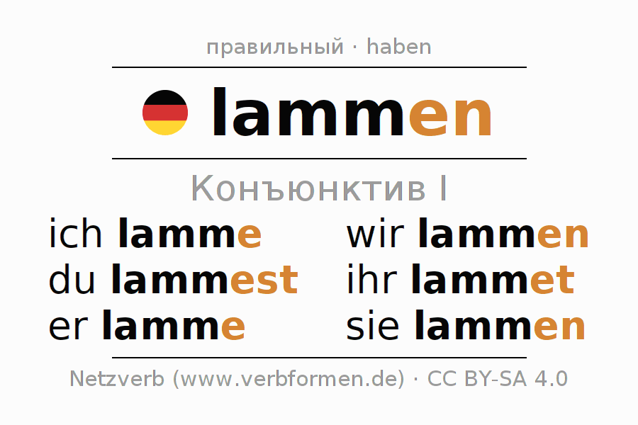 Спряжение lammen (объягниться, родить ягненка) в сослагательном наклонении I: ich lamme, du lammest, er lamme, wir lammen, ihr lammet, sie lammen.