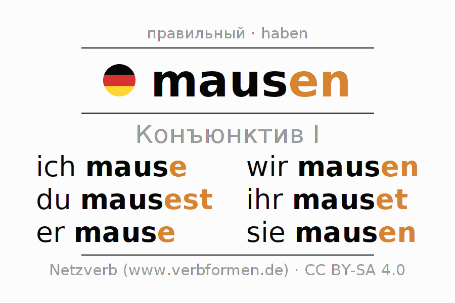 Спряжение mausen (воровать, коитус) в сослагательном наклонении I: ich mause, du mausest, er mause, wir mausen, ihr mauset, sie mausen.