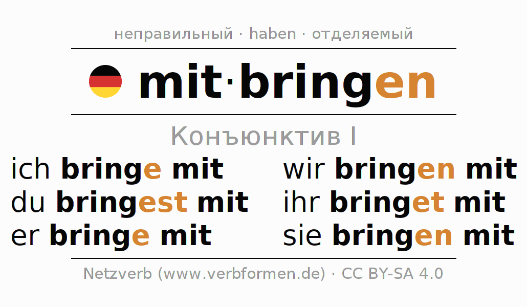 Спряжение mitbringen (приносить, приводить) в сослагательном наклонении I: ich bringe mit, du bringest mit, er bringe mit, wir bringen mit, ihr bringet mit, sie bringen mit.