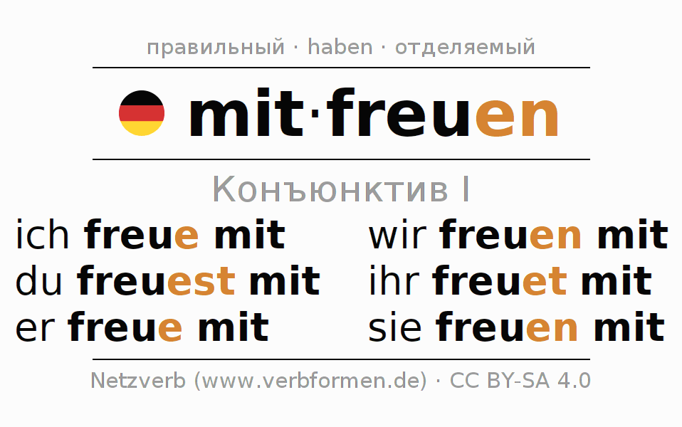 Спряжение mitfreuen (радоваться за других) в сослагательном наклонении I: ich freue mit, du freuest mit, er freue mit, wir freuen mit, ihr freuet mit, sie freuen mit.