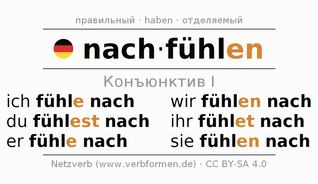 Спряжение nachfühlen (воспринять, понимать) в сослагательном наклонении I: ich fühle nach, du fühlest nach, er fühle nach, wir fühlen nach, ihr fühlet nach, sie fühlen nach.