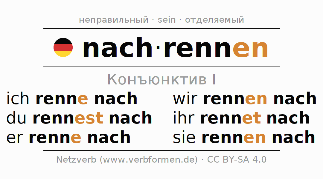 Спряжение nachrennen (преследовать, гнаться) в сослагательном наклонении I: ich renne nach, du rennest nach, er renne nach, wir rennen nach, ihr rennet nach, sie rennen nach.