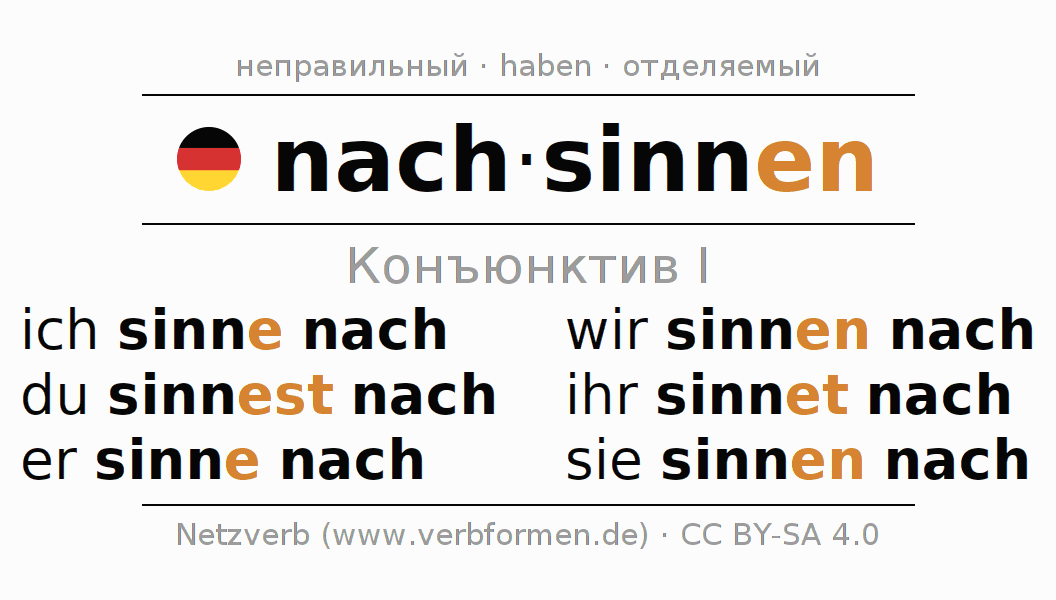 Спряжение nachsinnen (размышлять, размышление) в сослагательном наклонении I: ich sinne nach, du sinnest nach, er sinne nach, wir sinnen nach, ihr sinnet nach, sie sinnen nach.