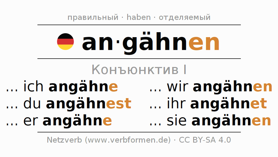 Спряжение angähnen в Koнъюнктив Презенс Сослагательное наклонение Действительный залог (актив): ... ich angähne, ... du angähnest, ... er angähne, ... wir angähnen, ... ihr angähnet, ... sie angähnen.Образование этих форм происходит по определённым грамматическим правилам. Так же спрягаются простые глагольные формы angähnen в Конъюнктив I. Kомментарии ☆