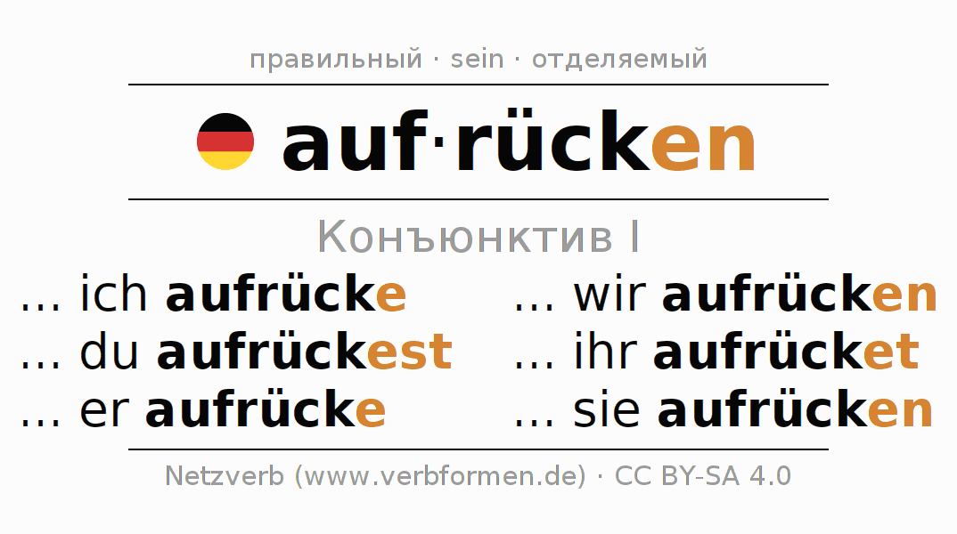 Спряжение aufrücken в Koнъюнктив Презенс Сослагательное наклонение Действительный залог (актив): ... ich aufrücke, ... du aufrückest, ... er aufrücke, ... wir aufrücken, ... ihr aufrücket, ... sie aufrücken.Образование этих форм происходит по определённым грамматическим правилам. Так же спрягаются простые глагольные формы aufrücken в Конъюнктив I. Kомментарии ☆