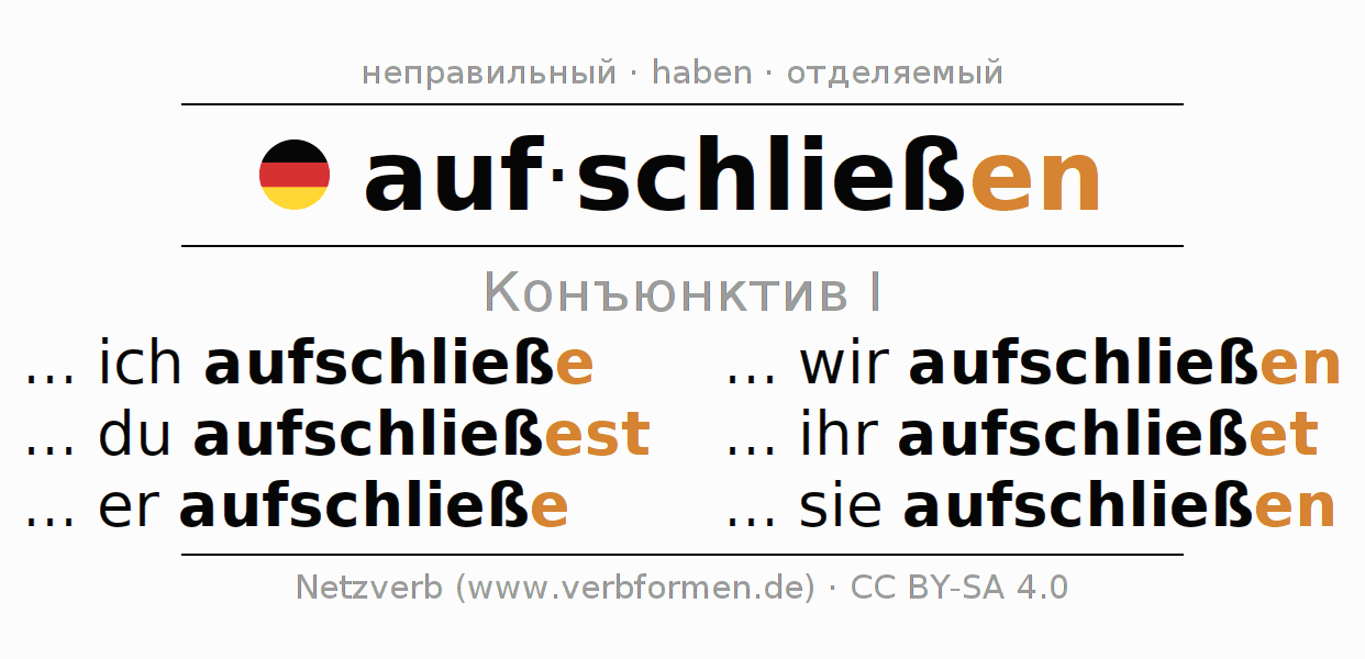 Спряжение aufschließen в Koнъюнктив Презенс Сослагательное наклонение Действительный залог (актив): ... ich aufschließe, ... du aufschließest, ... er aufschließe, ... wir aufschließen, ... ihr aufschließet, ... sie aufschließen.Образование этих форм происходит по определённым грамматическим правилам. Так же спрягаются простые глагольные формы aufschließen в Конъюнктив I. Kомментарии ☆
