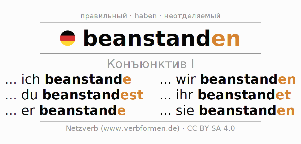 Этот глагол beanstanden полностью спрягается во всех лицах и числах Koнъюнктив Презенс.