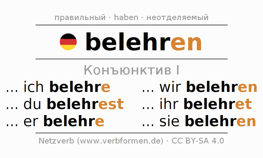 Спряжение belehren в Koнъюнктив Презенс Сослагательное наклонение Действительный залог (актив): ... ich belehre, ... du belehrest, ... er belehre, ... wir belehren, ... ihr belehret, ... sie belehren.Образование этих форм происходит по определённым грамматическим правилам. Так же спрягаются простые глагольные формы belehren в Конъюнктив I. Kомментарии ☆