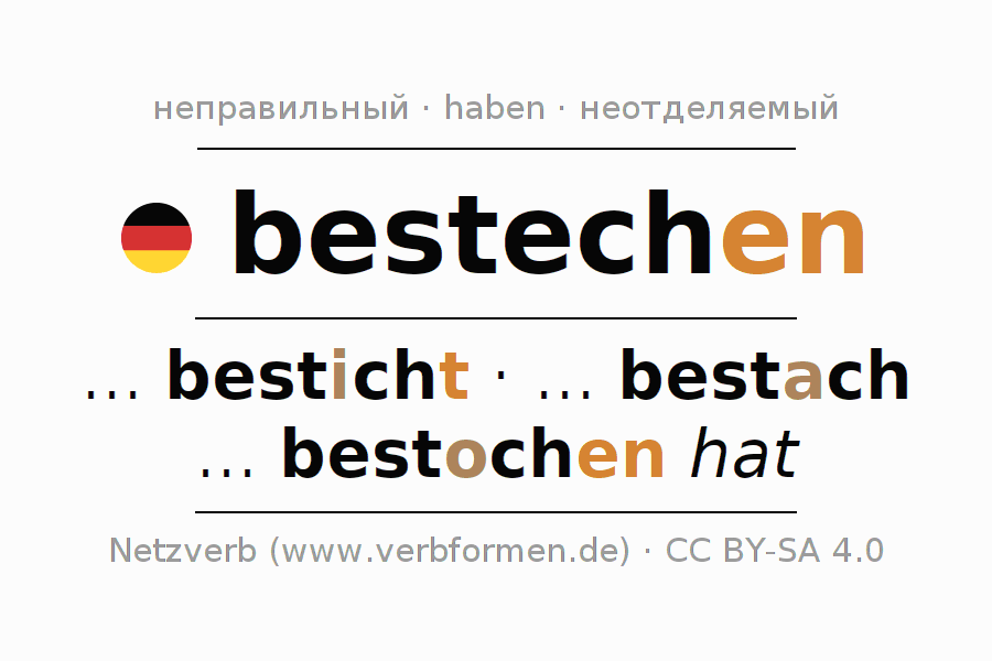 Спряжение bestechen в Koнъюнктив Презенс Сослагательное наклонение Действительный залог (актив): ... ich besteche, ... du bestechest, ... er besteche, ... wir bestechen, ... ihr bestechet, ... sie bestechen.Образование этих форм происходит по определённым грамматическим правилам. Так же спрягаются простые глагольные формы bestechen в Конъюнктив I. Kомментарии ☆