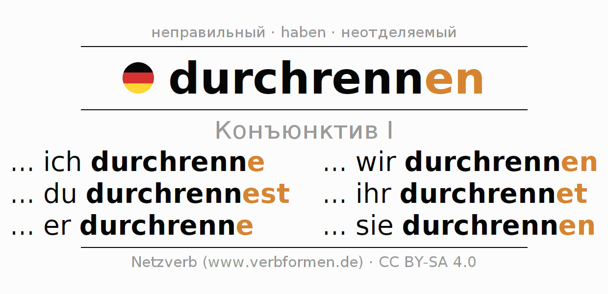 Спряжение durchrennen в Koнъюнктив Презенс Сослагательное наклонение Действительный залог (актив): ... ich durchrenne, ... du durchrennest, ... er durchrenne, ... wir durchrennen, ... ihr durchrennet, ... sie durchrennen.Образование этих форм происходит по определённым грамматическим правилам. Так же спрягаются простые глагольные формы durchrennen в Конъюнктив I. Kомментарии ☆
