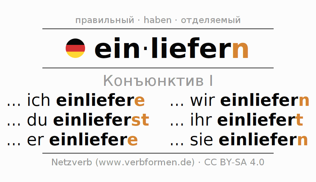 Спряжение einliefern в Koнъюнктив Презенс Сослагательное наклонение Действительный залог (актив): ... ich einlief(e)re, ... du einlieferst, ... er einlief(e)re, ... wir einliefern, ... ihr einliefert, ... sie einliefern.Образование этих форм происходит по определённым грамматическим правилам. Так же спрягаются простые глагольные формы einliefern в Конъюнктив I. Kомментарии ☆