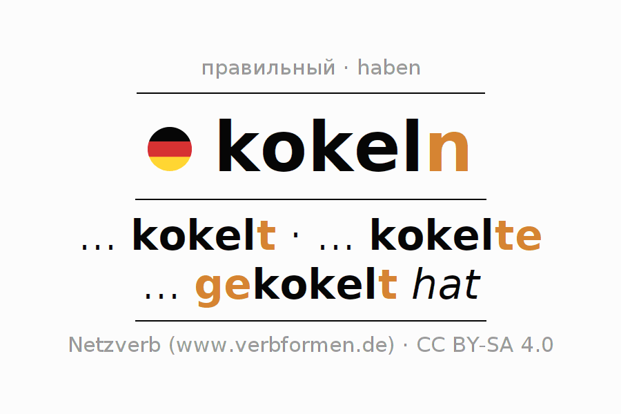 Спряжение kokeln в Koнъюнктив Презенс Сослагательное наклонение Действительный залог (актив): ... ich kok(e)le, ... du kokelst, ... er kok(e)le, ... wir kokeln, ... ihr kokelt, ... sie kokeln.Образование этих форм происходит по определённым грамматическим правилам. Так же спрягаются простые глагольные формы kokeln в Конъюнктив I. Kомментарии ☆