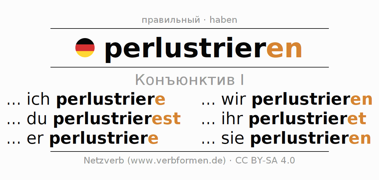 Спряжение perlustrieren в Koнъюнктив Презенс Сослагательное наклонение Действительный залог (актив): ... ich perlustriere, ... du perlustrierest, ... er perlustriere, ... wir perlustrieren, ... ihr perlustrieret, ... sie perlustrieren.Образование этих форм происходит по определённым грамматическим правилам. Так же спрягаются простые глагольные формы perlustrieren в Конъюнктив I. Kомментарии ☆