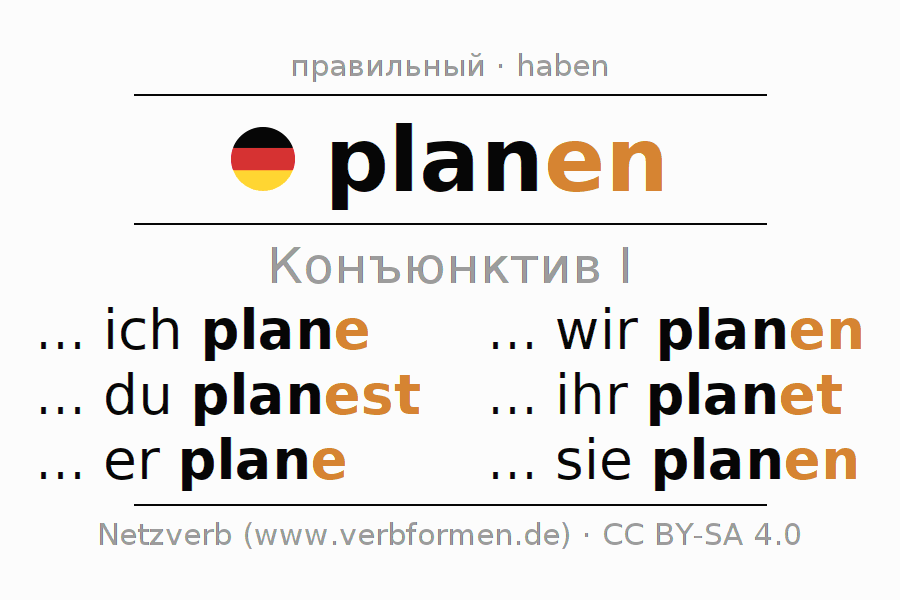 Спряжение planen в Koнъюнктив Презенс Сослагательное наклонение Действительный залог (актив): ... ich plane, ... du planest, ... er plane, ... wir planen, ... ihr planet, ... sie planen.Образование этих форм происходит по определённым грамматическим правилам. Так же спрягаются простые глагольные формы planen в Конъюнктив I. Kомментарии ☆