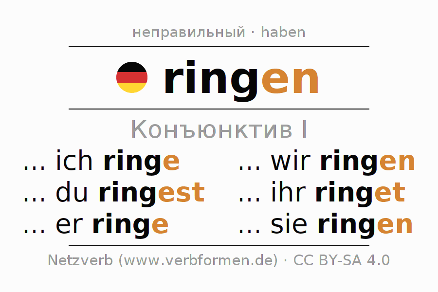 Спряжение ringen в Koнъюнктив Презенс Сослагательное наклонение Действительный залог (актив): ... ich ringe, ... du ringest, ... er ringe, ... wir ringen, ... ihr ringet, ... sie ringen.Образование этих форм происходит по определённым грамматическим правилам. Так же спрягаются простые глагольные формы ringen в Конъюнктив I. Kомментарии ☆