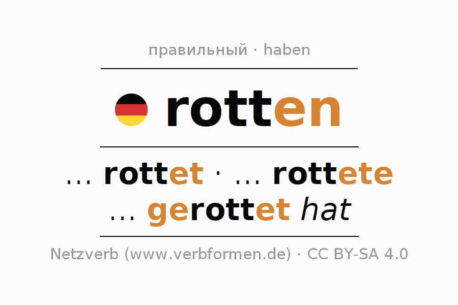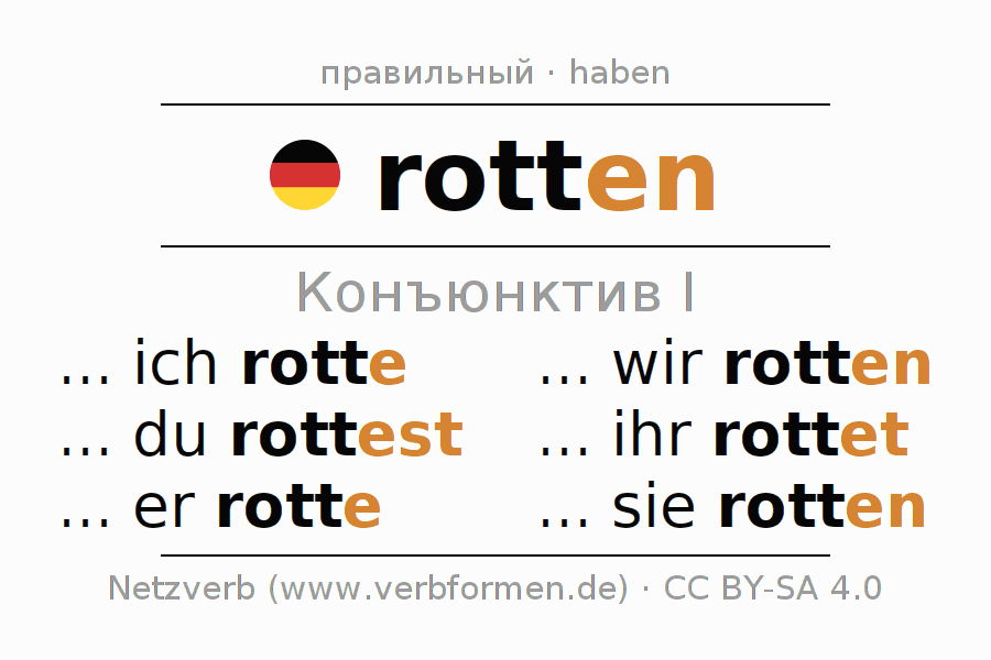Спряжение rotten в Koнъюнктив Презенс Сослагательное наклонение Действительный залог (актив): ... ich rotte, ... du rottest, ... er rotte, ... wir rotten, ... ihr rottet, ... sie rotten.Образование этих форм происходит по определённым грамматическим правилам. Так же спрягаются простые глагольные формы rotten в Конъюнктив I. Kомментарии ☆