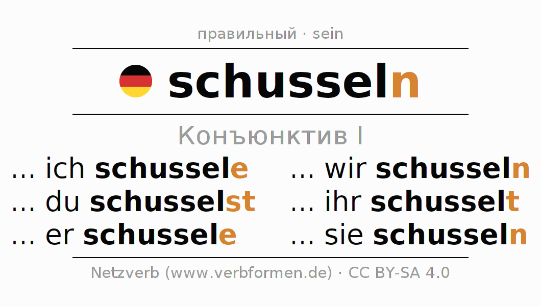 Спряжение schusseln в Koнъюнктив Презенс Сослагательное наклонение Действительный залог (актив): ... ich schuss(e)le, ... du schusselst, ... er schuss(e)le, ... wir schusseln, ... ihr schusselt, ... sie schusseln.Образование этих форм происходит по определённым грамматическим правилам. Так же спрягаются простые глагольные формы schusseln в Конъюнктив I. Kомментарии ☆