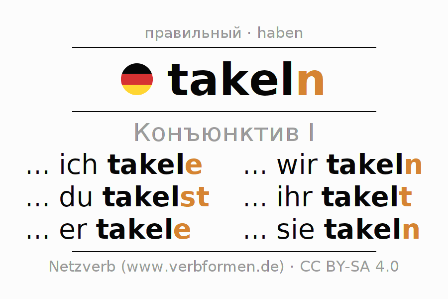 Спряжение takeln в Koнъюнктив Презенс Сослагательное наклонение Действительный залог (актив): ... ich tak(e)le, ... du takelst, ... er tak(e)le, ... wir takeln, ... ihr takelt, ... sie takeln.Образование этих форм происходит по определённым грамматическим правилам. Так же спрягаются простые глагольные формы takeln в Конъюнктив I. Kомментарии ☆