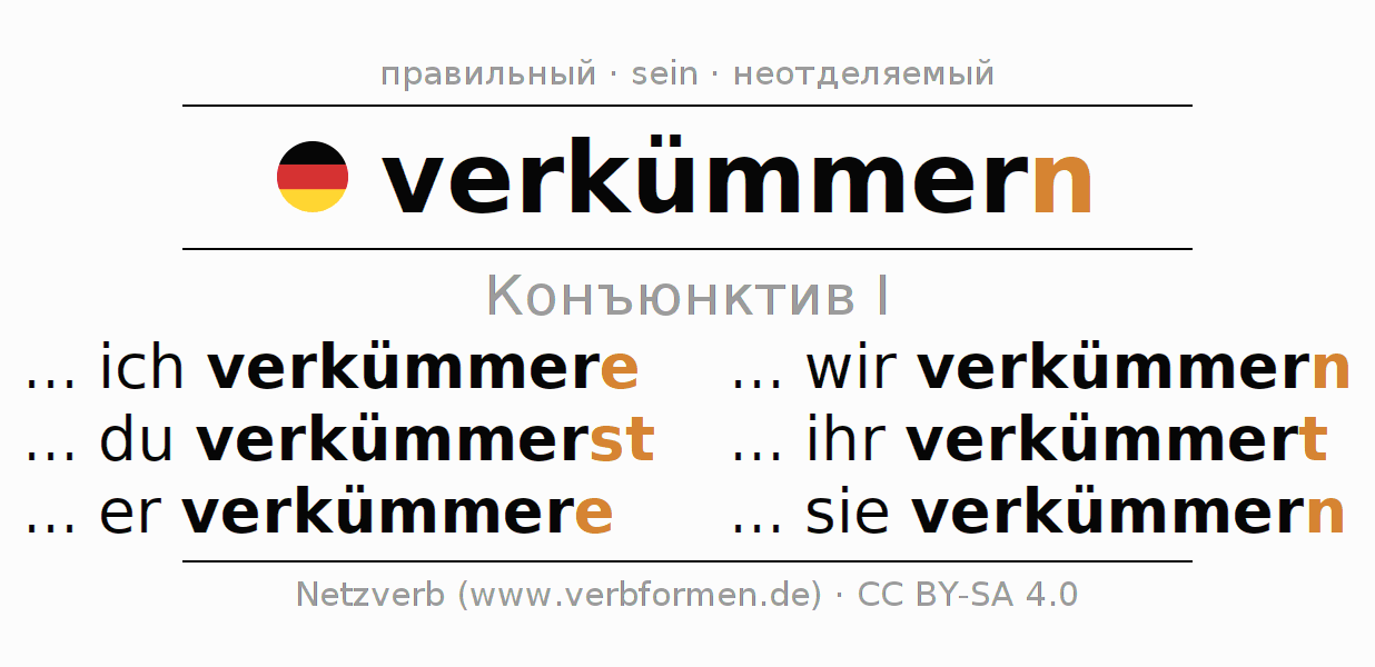 Спряжение verkümmern в Koнъюнктив Презенс Сослагательное наклонение Действительный залог (актив): ... ich verkümm(e)re, ... du verkümmerst, ... er verkümm(e)re, ... wir verkümmern, ... ihr verkümmert, ... sie verkümmern.Образование этих форм происходит по определённым грамматическим правилам. Так же спрягаются простые глагольные формы verkümmern в Конъюнктив I. Kомментарии ☆