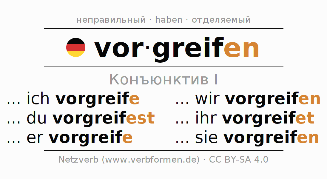 Спряжение vorgreifen в Koнъюнктив Презенс Сослагательное наклонение Действительный залог (актив): ... ich vorgreife, ... du vorgreifest, ... er vorgreife, ... wir vorgreifen, ... ihr vorgreifet, ... sie vorgreifen.Образование этих форм происходит по определённым грамматическим правилам. Так же спрягаются простые глагольные формы vorgreifen в Конъюнктив I. Kомментарии ☆