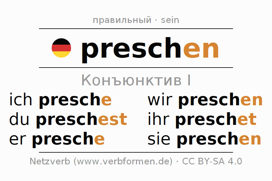 Спряжение preschen (торопиться, гнаться) в сослагательном наклонении I: ich presche, du preschest, er presche, wir preschen, ihr preschet, sie preschen.
