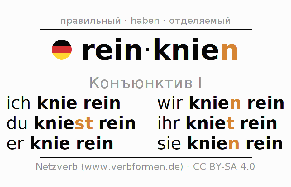 Спряжение reinknien (вкладываться, усердно работать) в сослагательном наклонении I: ich knie rein, du kniest rein, er knie rein, wir knien rein, ihr kniet rein, sie knien rein.