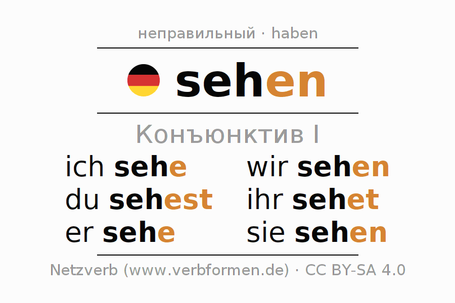 Спряжение sehen (смотреть, видеть) в сослагательном наклонении I: ich sehe, du sehest, er sehe, wir sehen, ihr sehet, sie sehen.