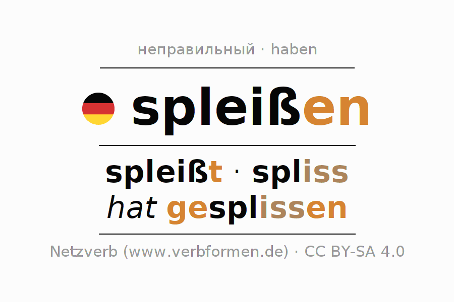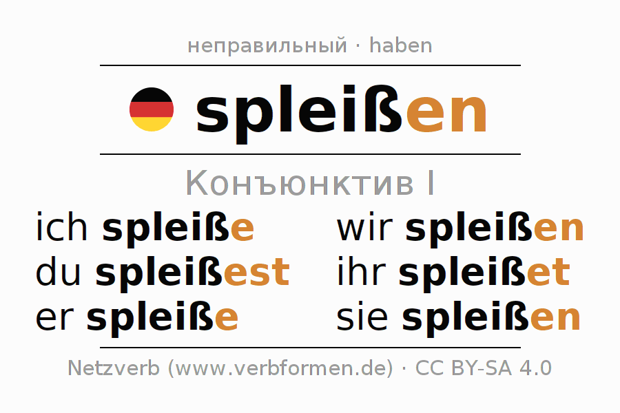 Спряжение spleißen (вырезать интроны, переплетать) в сослагательном наклонении I: ich spleiße, du spleißest, er spleiße, wir spleißen, ihr spleißet, sie spleißen.