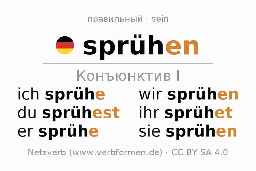 Спряжение sprühen (блеснуть, блестеть) в сослагательном наклонении I: ich sprühe, du sprühest, er sprühe, wir sprühen, ihr sprühet, sie sprühen.