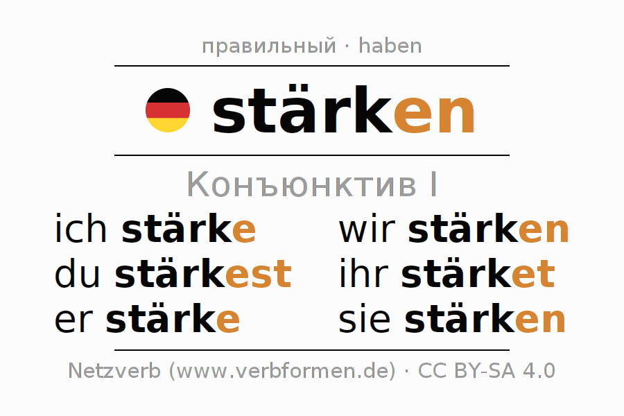 Спряжение stärken (укреплять, укрепить) в сослагательном наклонении I: ich stärke, du stärkest, er stärke, wir stärken, ihr stärket, sie stärken.
