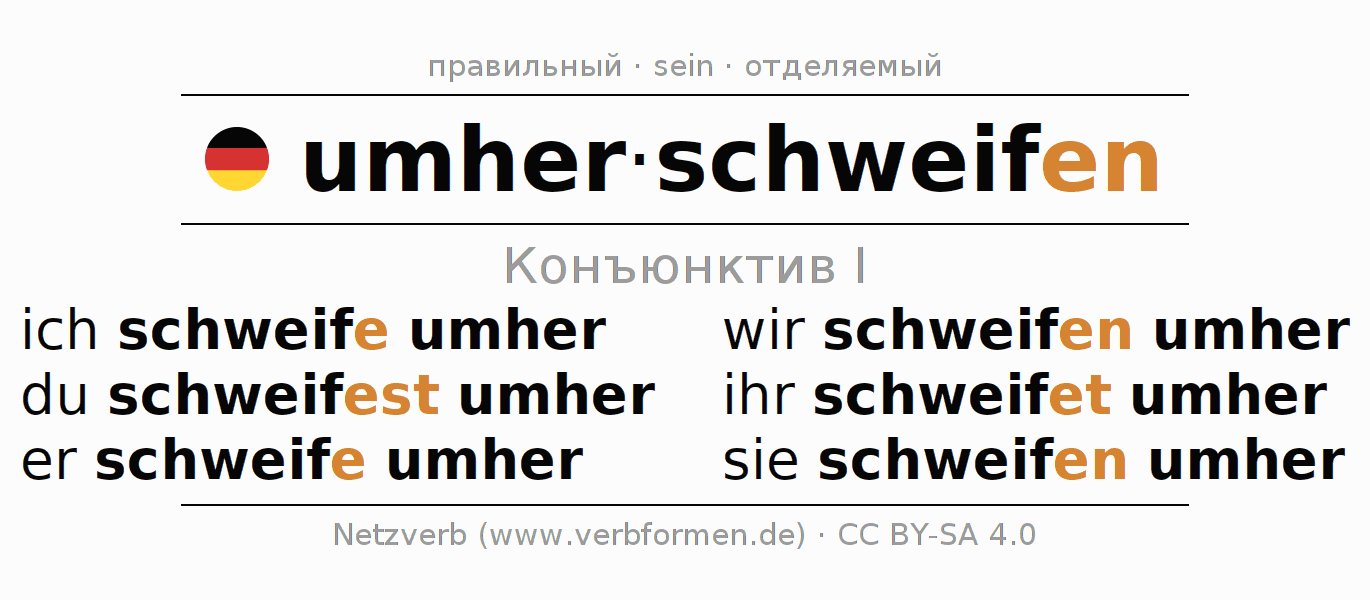 Спряжение umherschweifen (бегать, блуждать) в сослагательном наклонении I: ich schweife umher, du schweifest umher, er schweife umher, wir schweifen umher, ihr schweifet umher, sie schweifen umher.