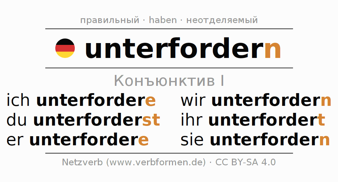 Спряжение unterfordern (недостаточно требовать) в сослагательном наклонении I: ich unterford(e)re, du unterforderst, er unterford(e)re, wir unterfordern, ihr unterfordert, sie unterfordern.