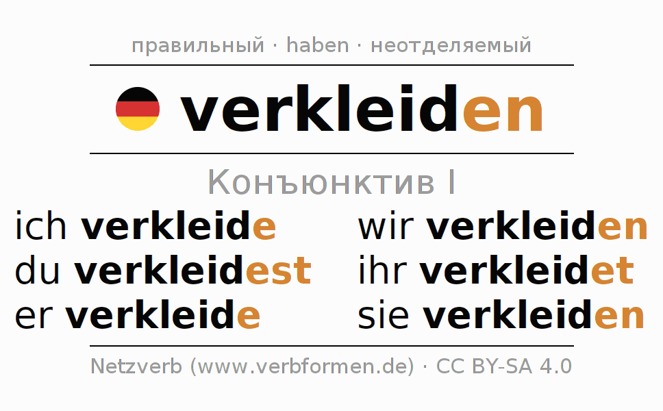 Спряжение verkleiden (переодеваться, переодевать) в сослагательном наклонении I: ich verkleide, du verkleidest, er verkleide, wir verkleiden, ihr verkleidet, sie verkleiden.